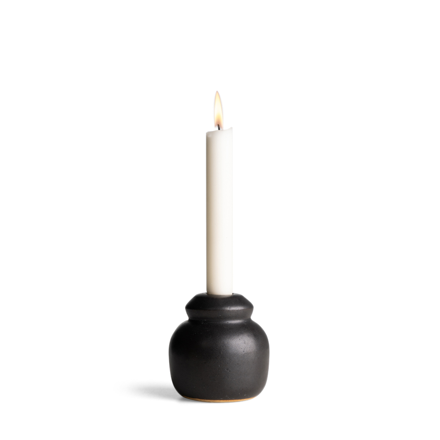 The Manjah Candle Holder brings a warmth and charm to your living spaces. The vase is available in two colors: natural fired clay, or matte black glaze. Designed by the Icelandic designer Hugdetta and brought to life by the master potters of the Lettie Stuart Pottery in Sierra Leone.
